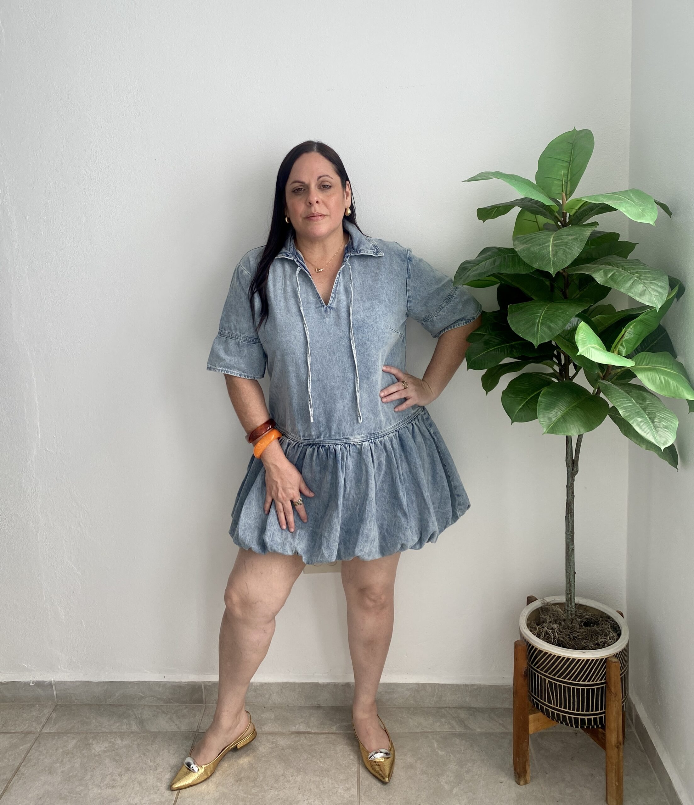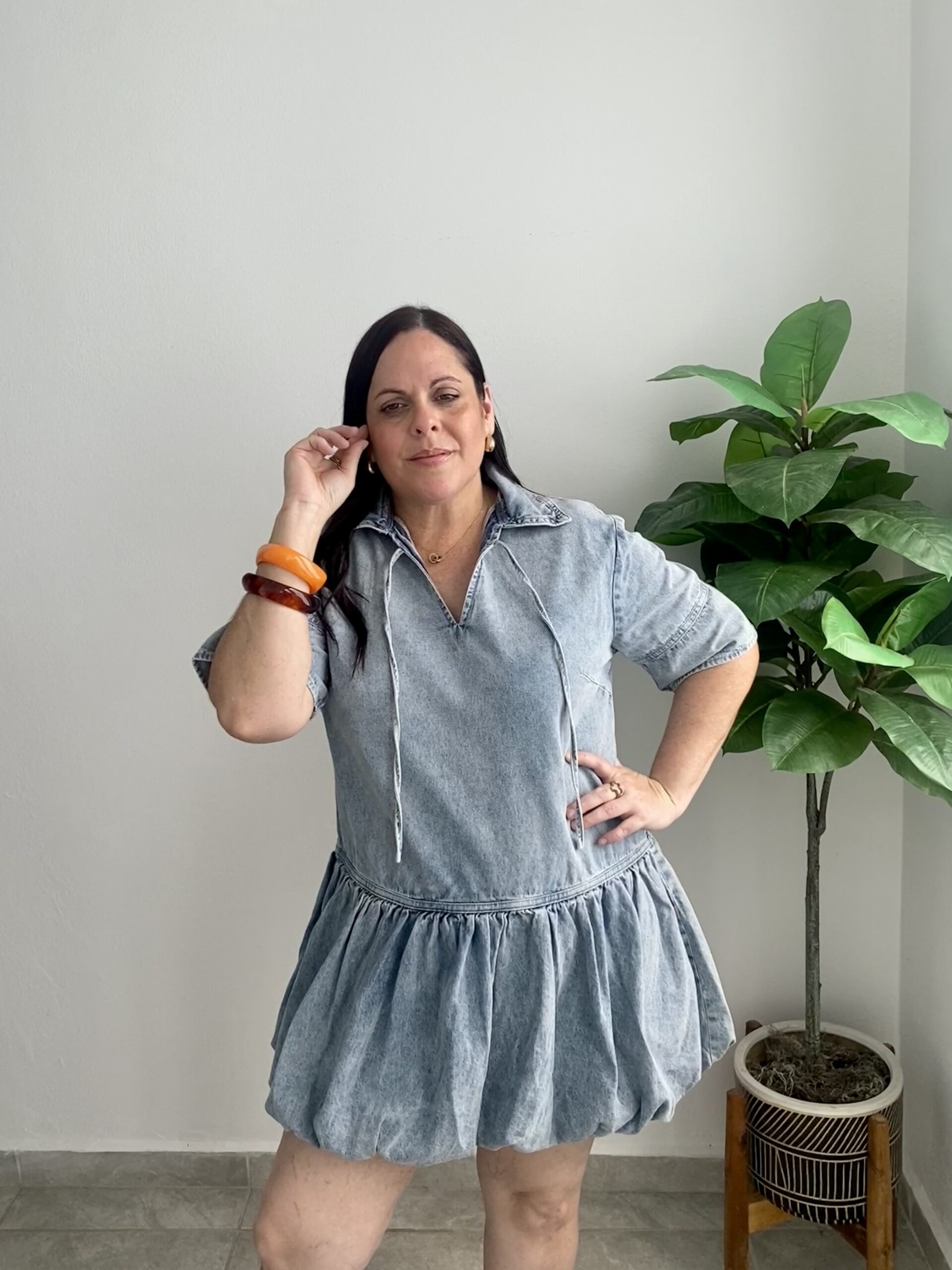 This bubble-style denim dress is super cute. Ideal for petite women. It’s short and falls just above the knee. It’s oversized for easy on and off. It’s a shirtdress style with a collar on the top. It stretches but isn’t too much. It’s made of medium-soft denim with a lined skirt.